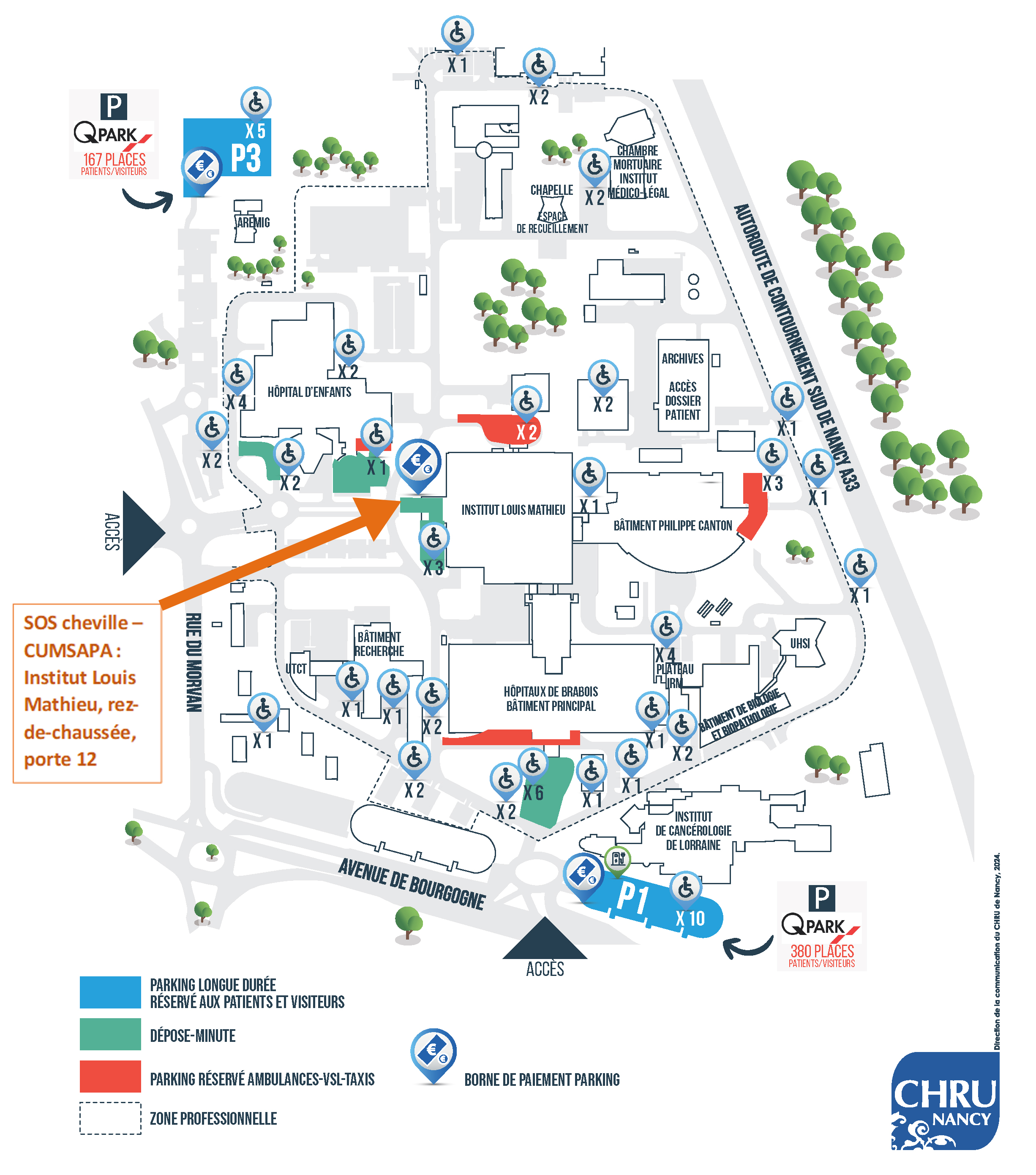 • Parkings réservés aux patients et visiteurs (payants) : P1 et P3 (voir le plan)